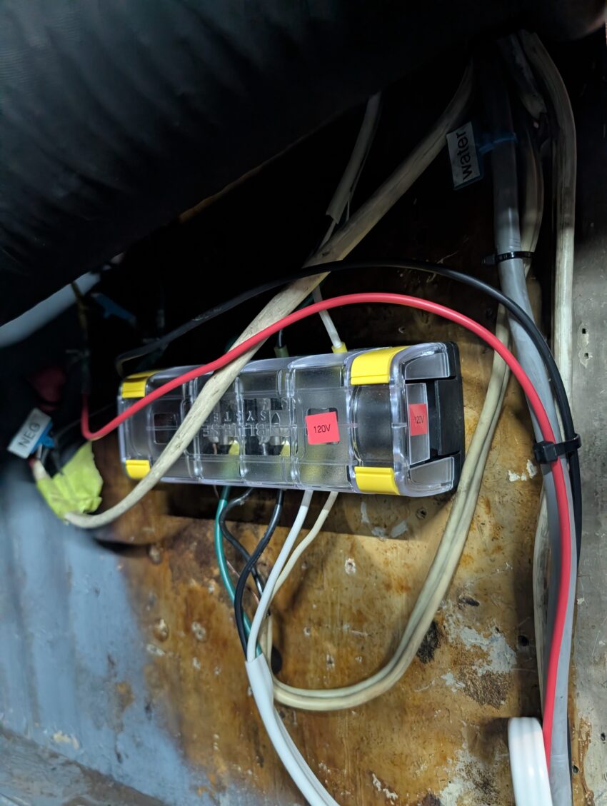 120v New receptacle installed and working. This is where the microwave and/or toaster goes when not stored in the cabinet below. I had to cut a chunk out of the back of the top drawer which weakened the structure of the drawer so I will have to revisit that at some point. Wired in the…