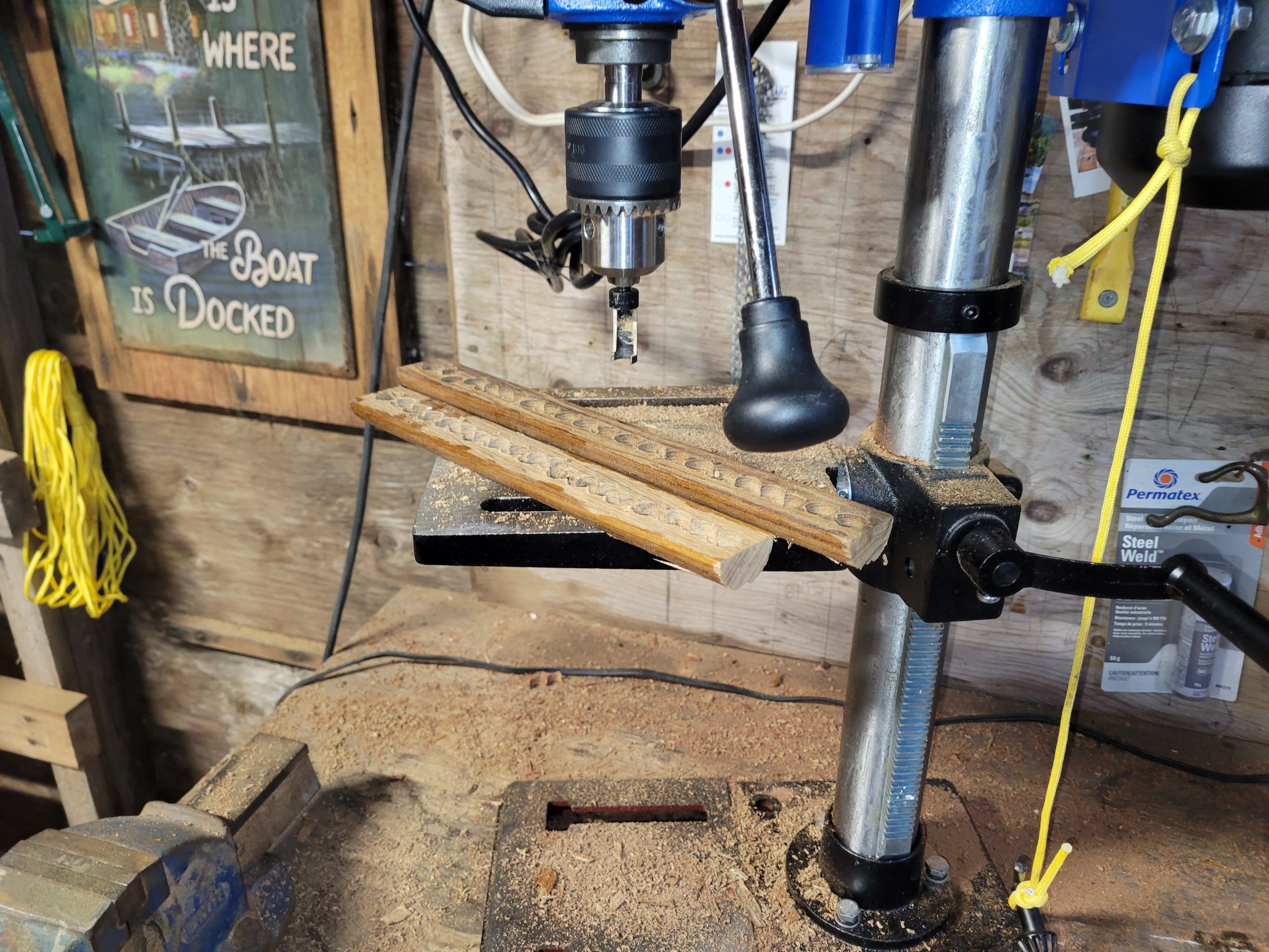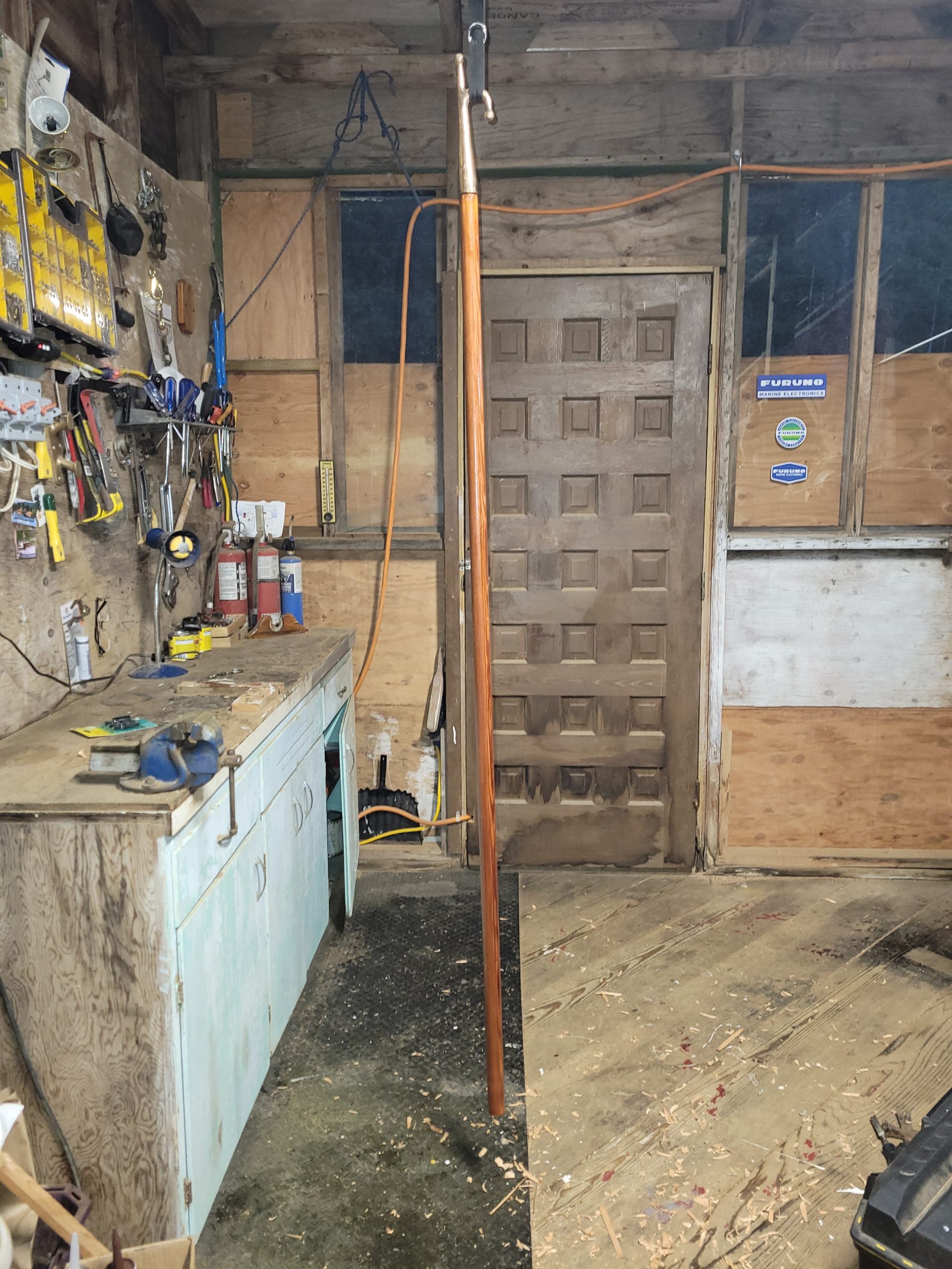 I received my pike pole end and got work creating a new pike pole. I used a closet rod of fir and put on a cedar knob at the end. Used a palm sander as a ‘lathe’ to finish the end.