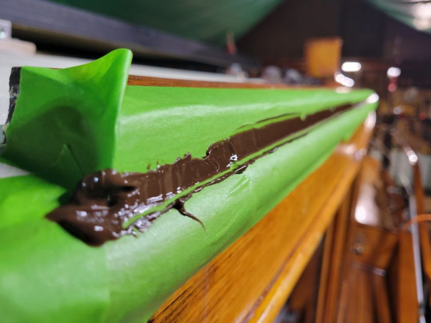 Fore Deck Refreshed the varnish on the fore deck. Wheel House Roof Sealed the seam on the trim around the wheel house roof. Sika Flex 291. Another coat of varnish on this trim and I am done with that roof – just regular maintenance. Transom I was going to apply the same sika flex over…