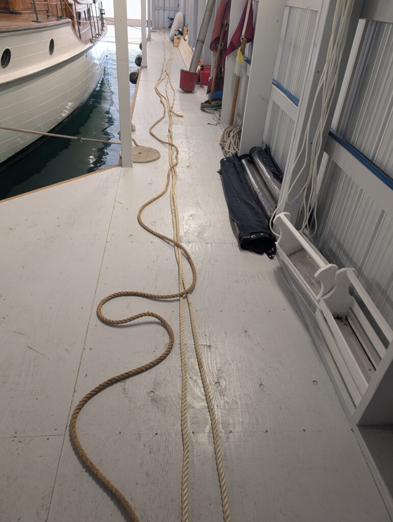 Pulled out the long rope from the chain locker and ran out in the boathouse to get an idea of the length. Looks like >150′.