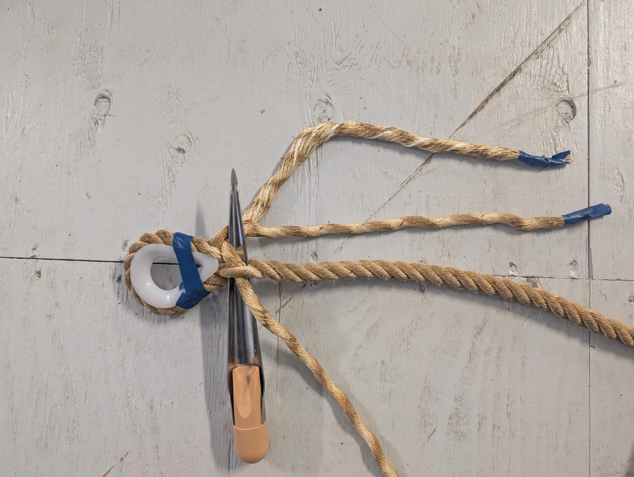Tried my hand at splicing a rope to a thimble. Not so great on the first attempt but ok on the other end of the rope. Even that ugly splice will hold ok. It was hard because the rope is old and very stiff.