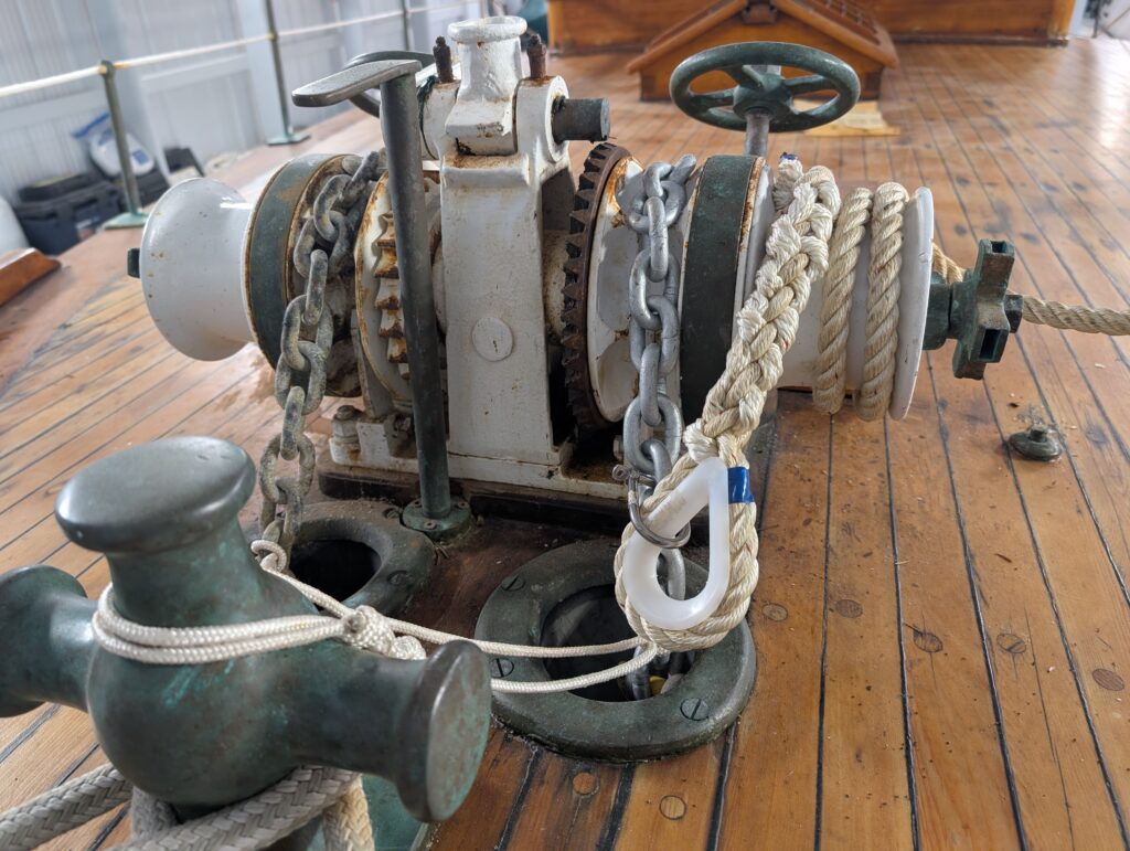 The idea here is that I run out the chain and then attach this rope using a shackle, release the bitter end, and carry on. The thimble will fit down the pipe so drawing it up should be the reverse. I like this better than splicing the rope into the chain as I am only using this as a backup – so not very often. I can also add it to the primary if I need more than its 150′ chain.